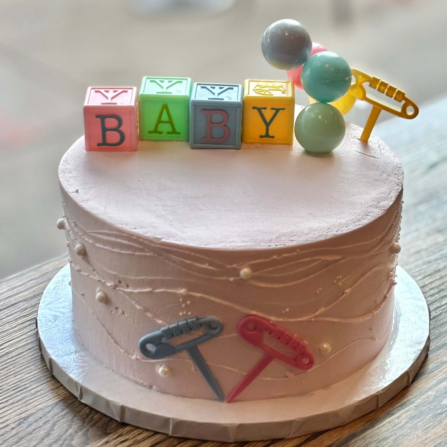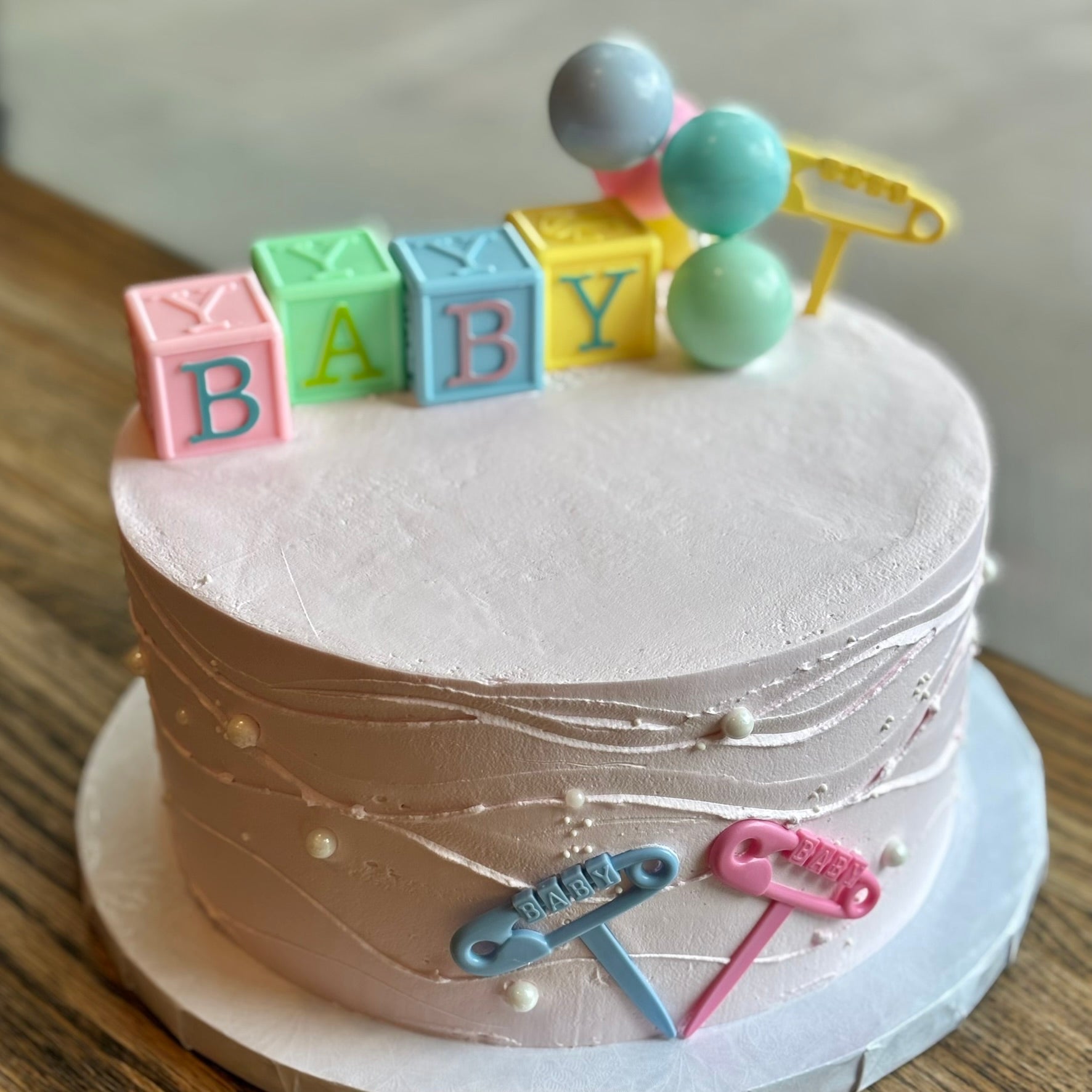 Celebrate life’s sweetest moments with our extra-high pastel Baby Shower Cake, decorated with baby blocks, playful toppers, and a smooth buttercream finish. Perfect for welcoming a little one.