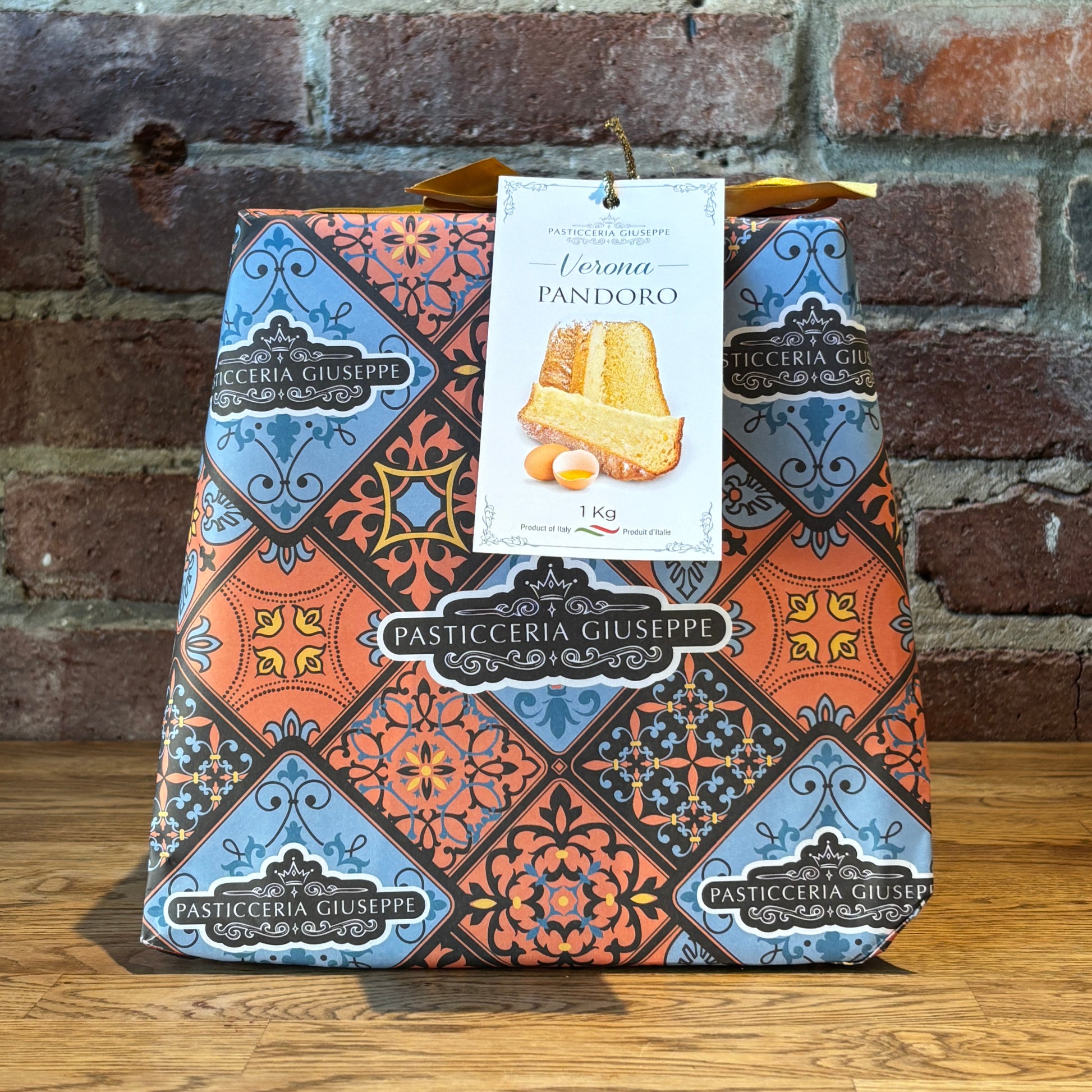 Pasticceria Giuseppe Pandoro is a classic Italian holiday cake known for its soft, airy texture and delicate sweetness. Made in Italy using traditional methods, this golden, star-shaped cake is lightly scented with vanilla and finished with a dusting of icing sugar for the perfect festive touch. Its tender crumb and buttery flavour make it ideal for sharing, gifting, or enjoying with coffee during the holidays.