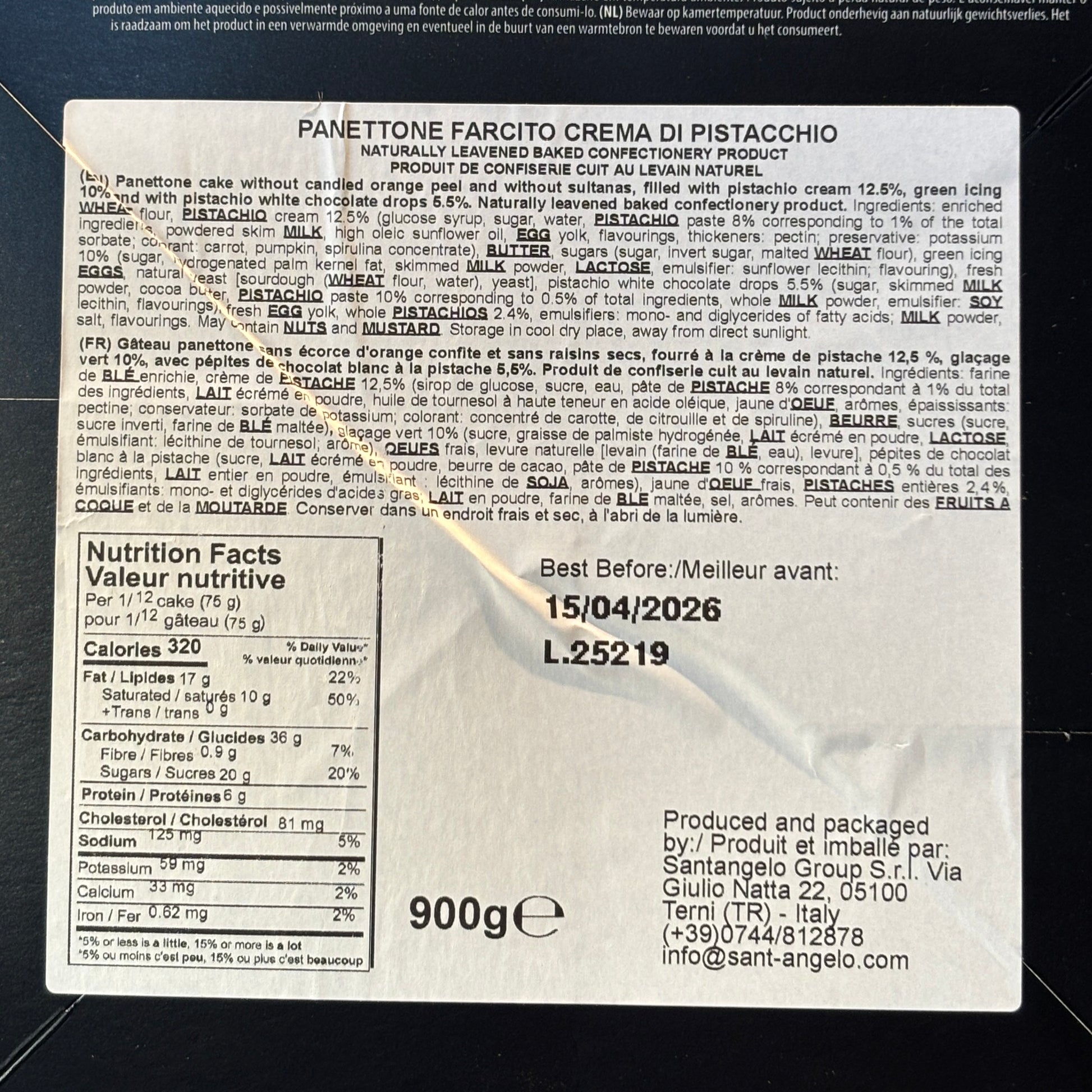 The Santangelo Panettone Pistachio Cream is a naturally leavened, oven-baked Italian confectionery cake that is richly filled and coated with a delicious pistachio cream. This decadent panettone is known for its soft, light, and airy texture, making it a luxurious twist on the traditional Italian Christmas cake.