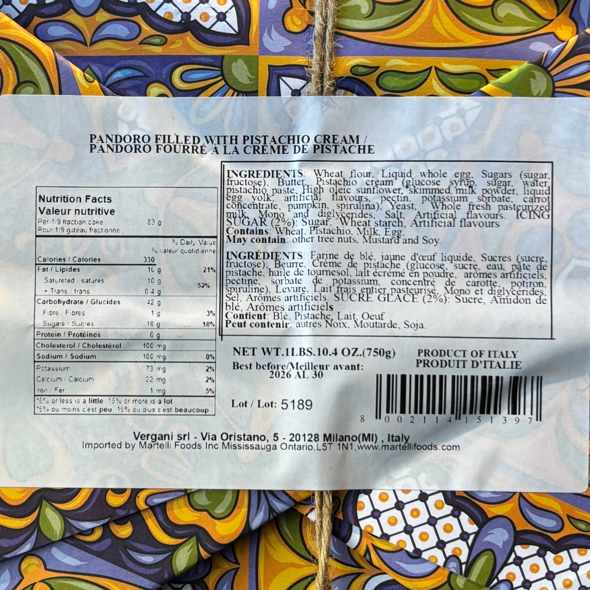 The Vergani Pandoro Pistachio is a soft, naturally leavened Italian holiday cake (Pandoro) that is filled with a rich, velvety pistachio cream and typically comes with a separate sachet of icing sugar. It is part of Vergani's "Sicily Trip" collection, celebrating the flavors of the region.