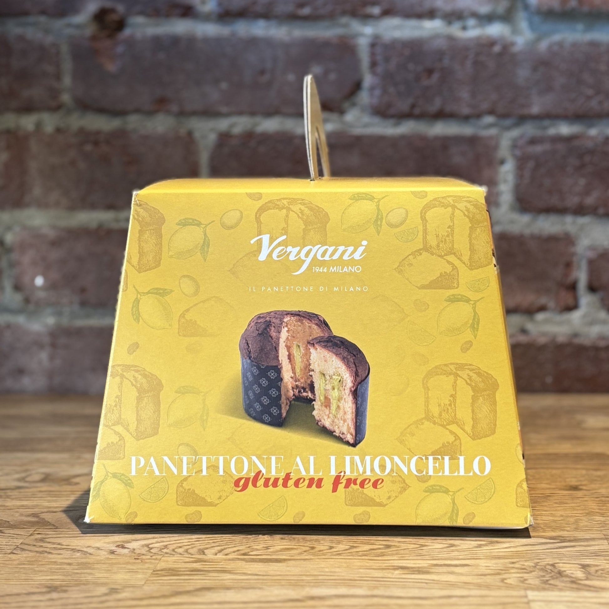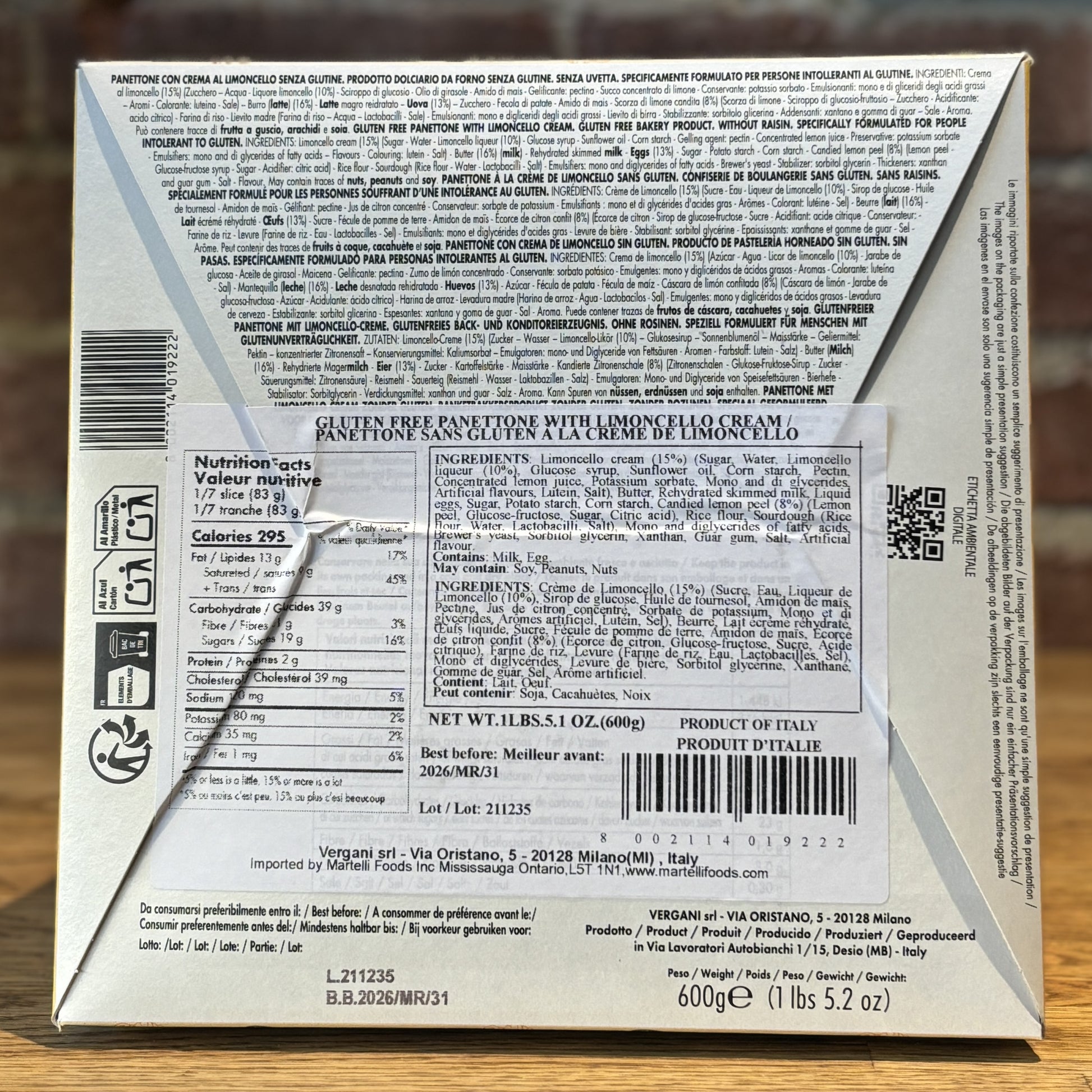The Vergani Panettone al Limoncello (Gluten Free) is a gluten-free version of the traditional Italian holiday cake, made with a lemon-infused limoncello cream filling instead of candied fruit or raisins. It is a naturally leavened, 600g product specifically formulated for those with gluten intolerance, aiming to provide the authentic taste and texture of Milanese panettone with a light, zesty flavor.