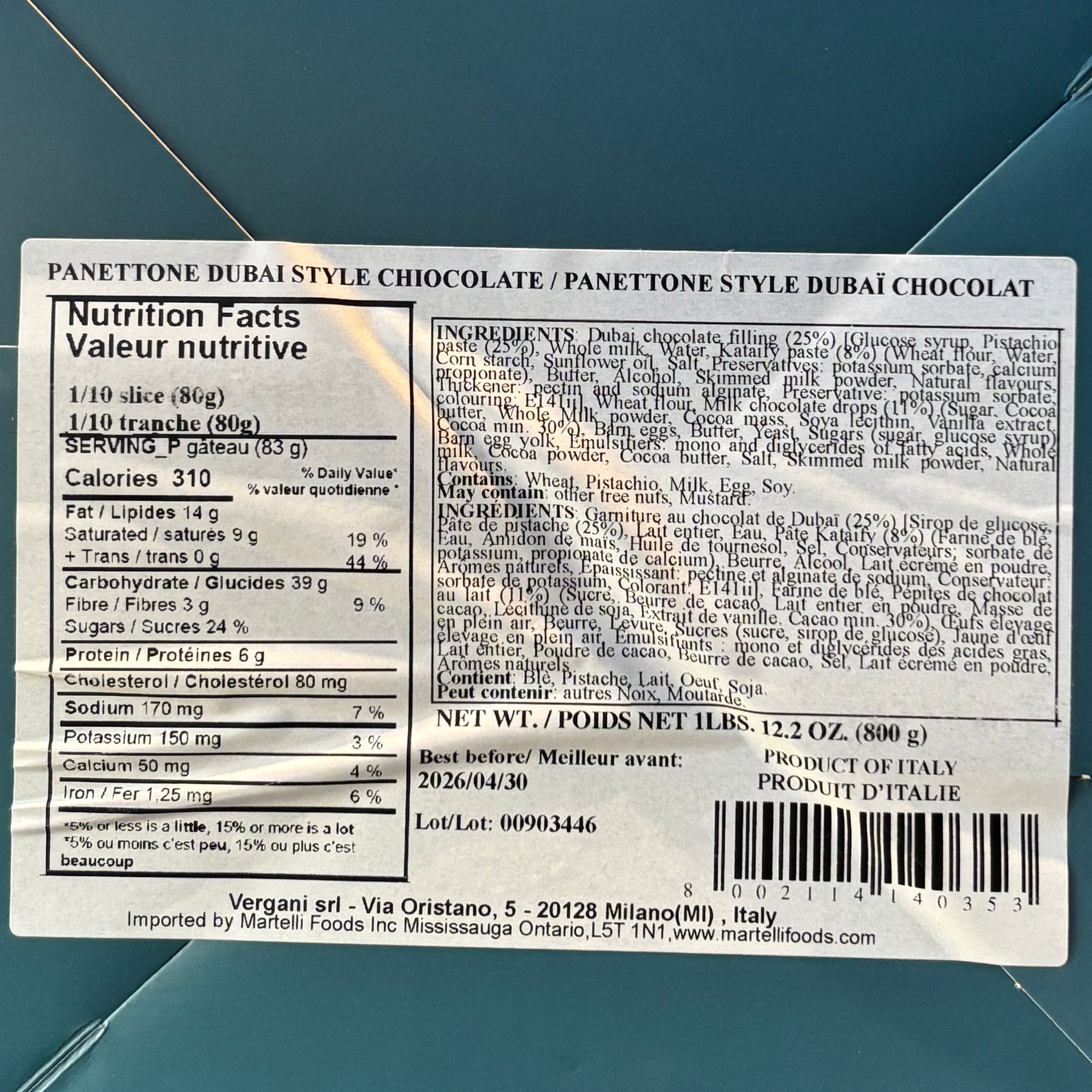 The Vergani Panettone Dubai Style Chocolate (also known as the Vergani Panettone Dubai Style Chocolate, Pistachio and Kataifi) is a luxurious fusion of Italian tradition and Middle Eastern flavors, featuring a soft panettone filled with a velvety pistachio cream and crispy kataifi pastry for a unique crunch.